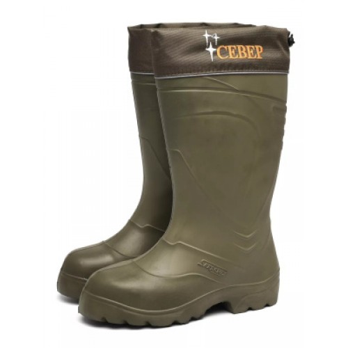 Сапоги оливкового цвета из ЭВА «Север» с надставкой на шнуровке изготовлены методом литья под давлением. Имеют 2-сл чулок из фольгированного полотна и натурального меха. Обладают высокими теплоизолирующими свойствами, сохраняют тепло до -40с, абсолютно водонепроницаемы, а также защищают от сырой нефти, от нефтяных масел и продуктов тяжелых фракций, от растительных и животных масел и жиров, от кислот концентрации до 80%, от растворов щелочей концентрации до 50%. Малый вес сапог экономит силы при ходьбе. Подошва с ярко выраженным протектором очень устойчива и превосходно защищает от скольжения. Упаковывается в индивидуальный короб.