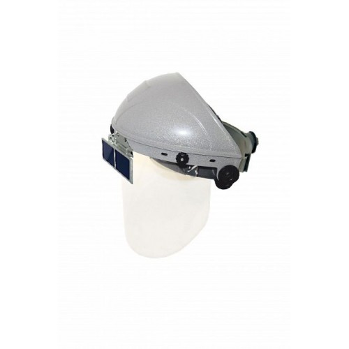 Термостойкий лицевой щиток с наголовным креплением и храповым механизмом регулировки оголовья. Козырек выполнен из термостойкого материала с добавлением металлических теплоотражающих частиц. Дополнительно защищает лобную часть головы пользователя от высоких температур и проникновения теплового излучения. Увеличенный экран из твердого, оптически прозрачного, ударопрочного и термостойкого поликарбонат защищает от высокоскоростных летящих частиц с низкоэнергетическим ударом. Экран удлиненный для дополнительной надежной защиты шеи и верхней части груди от механических повреждений и высокой температуры. Оптический класс 1.