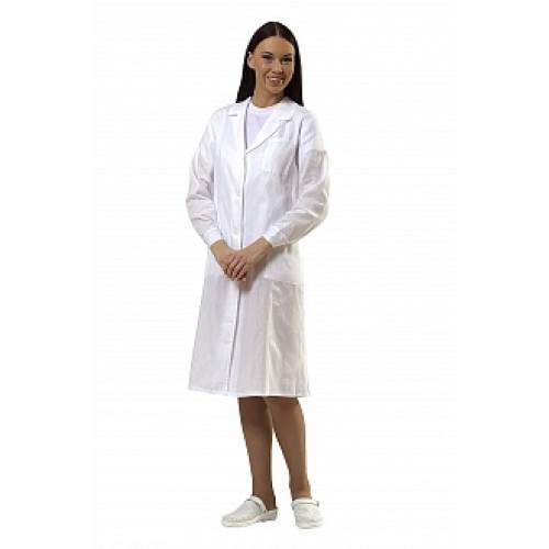 Халат с центральной застежкой на пуговицы, с отложным классическим воротником, одним нагрудным и двумя накладными боковыми карманами. Рукава с манжетами, застегивающимися на пуговицы.