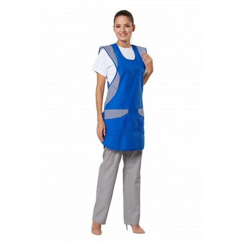 Фартук с завязками, с фигурным оформлением низа изделия и декоративной отделкой из контрастной ткани на плечах, по бокам, на накладных карманах.