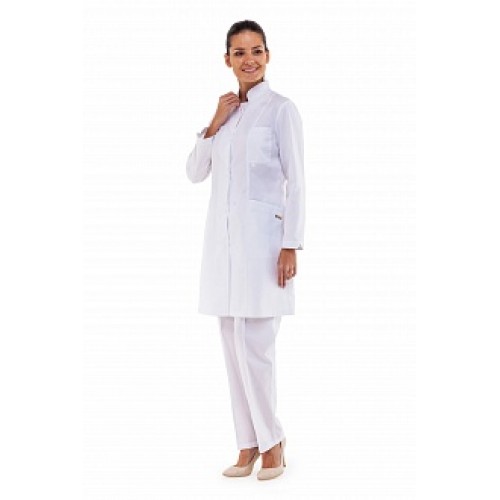 Халат полуприлегающего силуэта, с рельефами, с воротником-стойкой, с застежкой на кнопки. Два нижних кармана и один нагрудный карман с петлей для крепления бейджа. Длина халата до середины колена, что позволяет носить халат как отдельным предметом так и в комплекте с брюками. Отделка белым кантом по контуру стойки, карманам и низу рукавов.