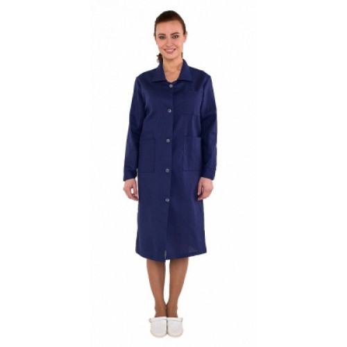 Халат рабочий свободного покроя, с застежкой на пуговицах. Рукава втачные длинные. Воротник в халате - отложной. Халат рабочий темно-синий - длинный, удобный в работе.