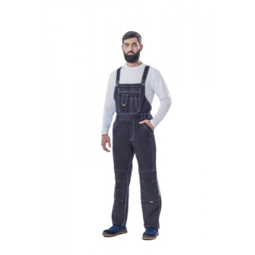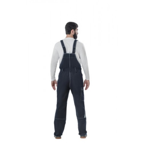 Полукомбинезон с застежкой гульфика на молнию и застежкой в боковом шве на пуговицы, с накладным фигурным карманом нагрудника застегивающимся на молнию, нижними внутренними боковыми карманами, с объемными наколенниками с нижним входом для амортизационного вкладыша, с накладным карманом на правом боковом шве на молнии. В полукомбинезоне предусмотрен СВ кант и фигурный СОП для обозначения сигнальной видимости.