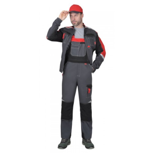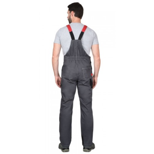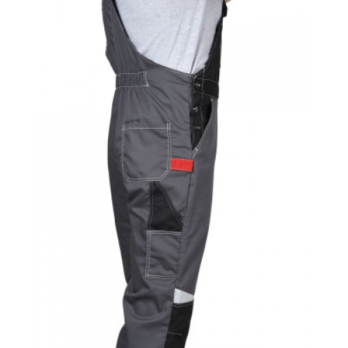 Полукомбинезон с застежками: гульфик на молнию, левая боковая на пуговицы. На грудке многофункциональный карман с клапаном на липучку. На левом боковом шве накладной функциональный карман с клапаном на липучку. Задние половинки с накладным карманом и карманами для инструментов. По спинке резинка для лучшего прилегания. Полукомбинезон с бретелями, длина регулируется резинкой и застежкой-фастексом. По шаговым швам усилительные фигурные накладки.