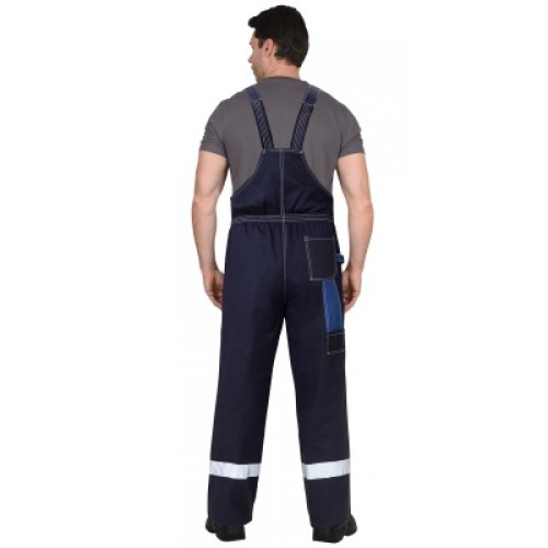 Полукомбинезон синего цвета с васильковой отделкой прямого покроя, с притачным нагрудником, с наколенниками, с накладным комбинированным фигурным карманом с фигурным клапаном на нагруднике; с боковыми внутренними карманами; с накладным карманом на правой задней половинке п/к; с карманами для инструмента.