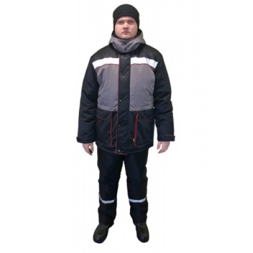 Куртка утепленная с центральной застежкой на молнию и ветрозащитным клапаном. Перед и спинка с отрезными кокетками, выполненными из отделочной ткани. На правой части переда вертикальный нагрудный карман "в рамку" на молнии и карман для мобильного телефона/рации, два нижних кармана с листочкой. Верхняя деталь рукава из отделочной ткани, низ рукава с внутренней манжетой. По швам притачивания кокеток и притачивания нижней детали рукава настрочена световозвращающая лента 50 мм. Воротник - стойка. Низ куртки с притачным поясом на резинке. Капюшон утепленный отстегивающий. Светоотражающая лента серебристо-серого цвета обеспечивает безопасность работника, находящегося в условиях ограниченной видимости.