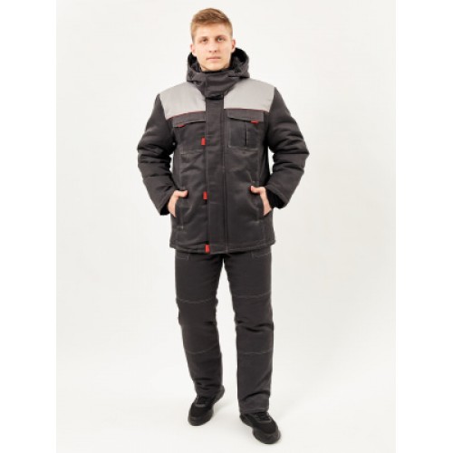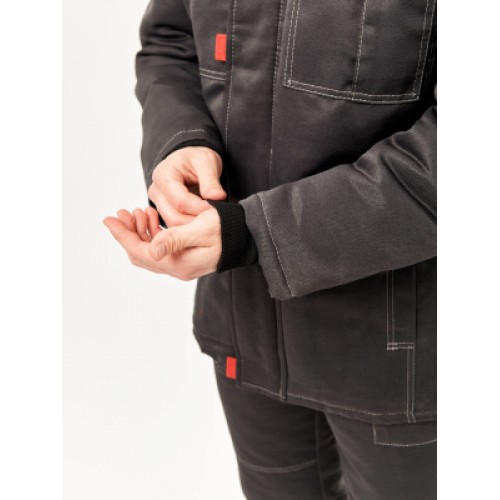Куртка с центральной застежкой на молнию и утепленным ветрозащитным клапаном на липучках. Нагрудные накладные карманы с утепленными клапанами на липучке. Напротив каждой липучки вставлен красный флажок. Кокетки полочек и спинки выделены красным кантом. В рукавах - трикотажные напульсники. Внутренняя кулиса по линии талии для регулировки ширины куртки со шнуром-резинкой и фиксаторами. Накладной карман на липучке со стороны подкладки левой полочки. Отстегивающийся капюшон на молнии с лицевой кулисой со шнуром-резинкой и фиксаторами и хлястиком на полукольцах для регулировки высоты капюшона.