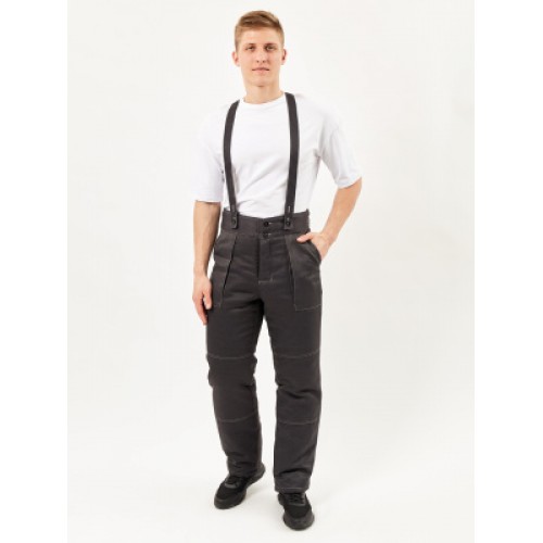 Брюки прямые, на широком утепленном поясе, завышенным со стороны спины, на съемных бретелях на пуговицах, регулируется по ширине с помощью хлястиков на пуговицах в боковых швах. Накладные карманы со складкой в верхней части брюк. По низу кулиса со шнуром-резинкой и фиксаторами.